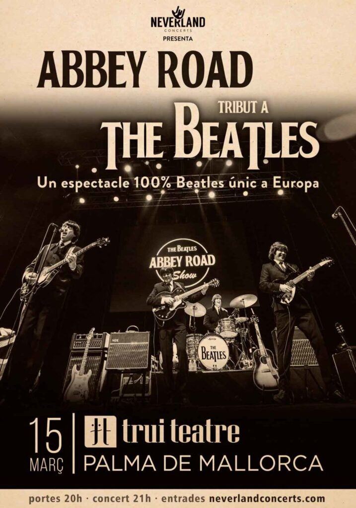 La Abbey Road Band, una de las mejores bandas tributo a los Beatles del mundo, actuará en el Trui Teatro de Palma. Este grupo es conocido por sus recreaciones de alta fidelidad de la música de los Beatles, utilizando instrumentos originales y vestuario adecuado a las diferentes épocas de la banda. Su repertorio incluye éxitos como «Love Me Do», «She Loves You», «I Want To Hold Your Hand», «Help!», «Yesterday», «Penny Lane», «Hey Jude», «Let It Be» y muchos otros. A lo largo de 30 años de carrera, la banda ha dado más de 2.000 conciertos en cuatro continentes, incluidas actuaciones en Miami y Túnez.