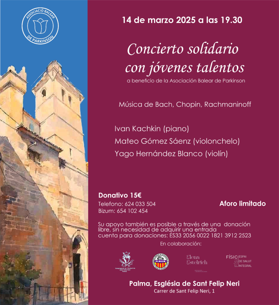 In der Kirche San Felipe Neri in Palma findet ein Benefizkonzert junger Talente zugunsten der Balearic Parkinson’s Association statt. Die Balearic Parkinson’s Association ist eine gemeinnützige Organisation, die gegründet wurde, um Menschen , die von der Parkinson-Krankheit betroffen sind, zu unterstützen.