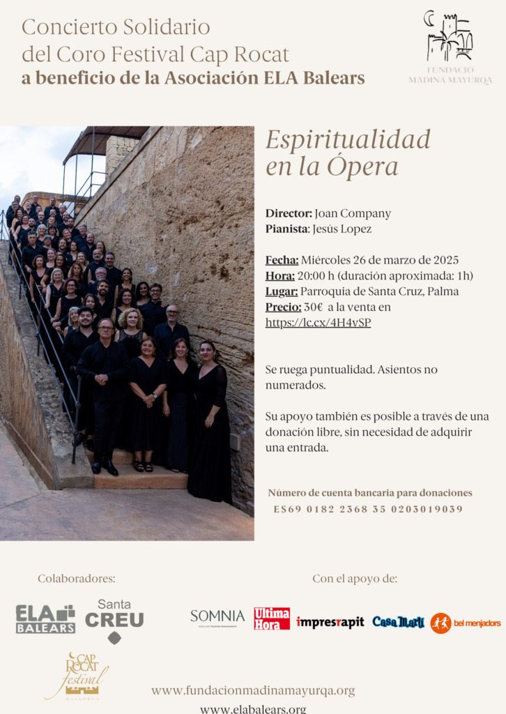 In the church of the Holy Cross in Palma there will be a charity concert of the choir Festival Cap Rocat titled «Spirituality in opera», organized in support of the Association ELA Balears. ELA Balears is a non-profit organization founded in 2018, whose goal is to support people suffering from amyotrophic lateral sclerosis (ALS).