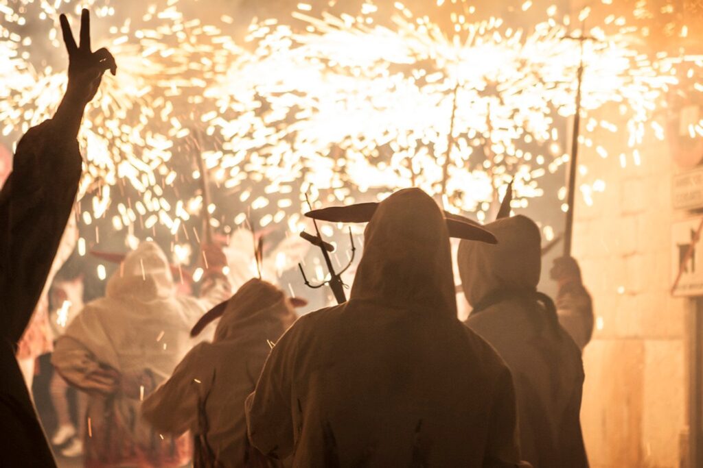 On the evening of the 16th, Revetlla de Sant Antoni begins, it’s a night vigil accompanied by the entrance of the demons (dimonis), traditional music and dancing. The locals will gather around bonfires (foguerons) where they will roast local sausages: sobrassada, botifarron, and also eat espinagades (fish pies) and cocas con peppers (another type of local pies).