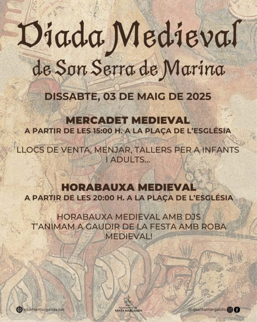 La Diada Medieval en Son Serra Marina tendrá lugar el primer fin de semana de mayo, cuando la zona costera se transformará en una auténtica ciudad medieval junto al mar. Habrá una feria de artesanía, música medieval en directo, tambores, bailes y un espectáculo de fuego al atardecer.