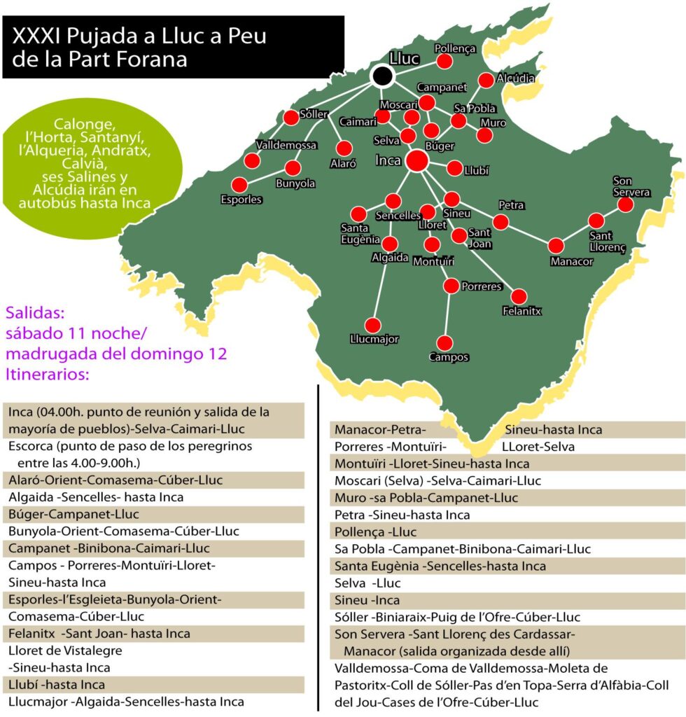 La peregrinación comienza en diferentes pueblos y ciudades de la isla, especialmente en la llamada «Part Forana», la parte rural de Mallorca, fuera de la capital, Palma. Los participantes van en grupos -con amigos, familias o personas afines- y caminan decenas de kilómetros para llegar al monasterio al amanecer.