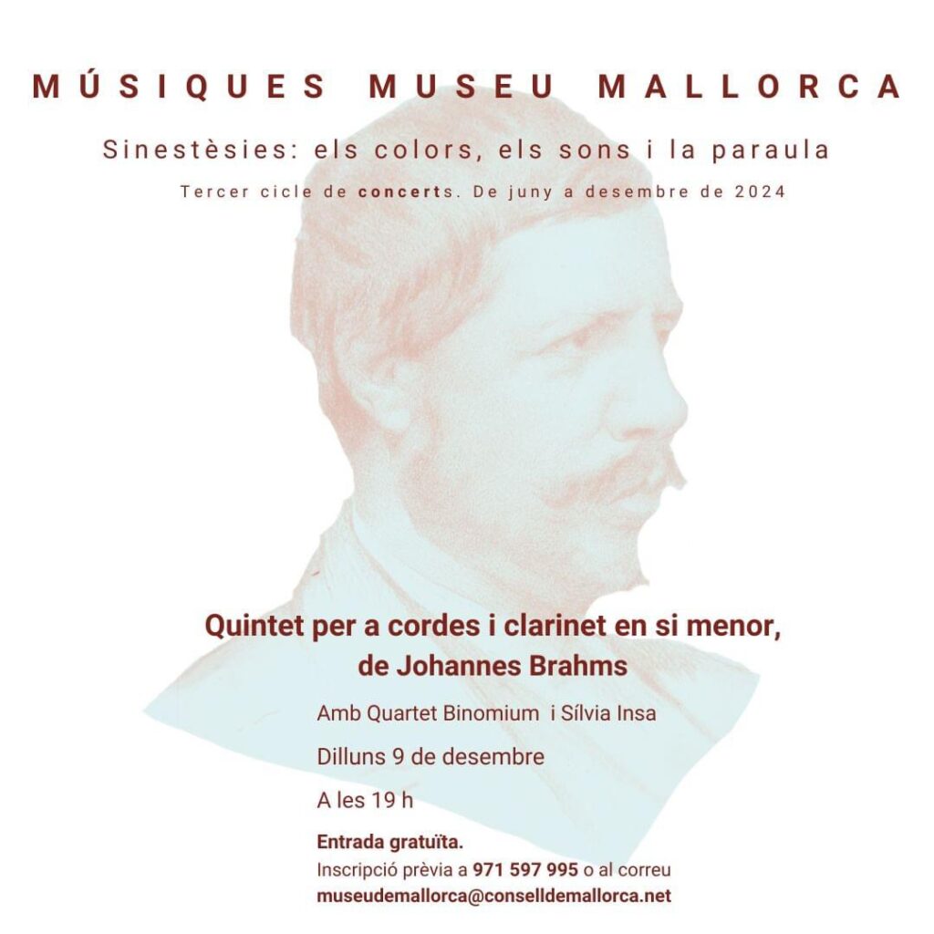 В музее Майорки пройдет концерт, который является частью серии «Синестезия цвета, звука и слова». На концерте будет исполнен “Квинтет для струнных и кларнета си минор Иоганнеса Брамса. Исполнители: квартет “Биномиум” и кларнетистка Сильвия Инса.