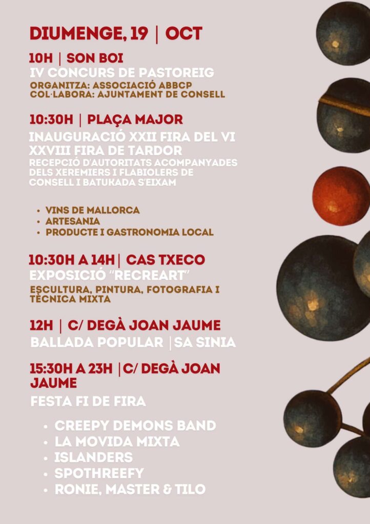 С 16 по 19 октября 2025 года в городке Консель на Майорке пройдут XXVIII Осенняя ярмарка и XXII Ярмарка вина — традиционные события, объединяющие местную культуру, гастрономию и ремесло.